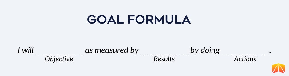 A goal has three components: what you will achieve, how you will measure its achievement, and what you need to do to achieve it. Our formula: